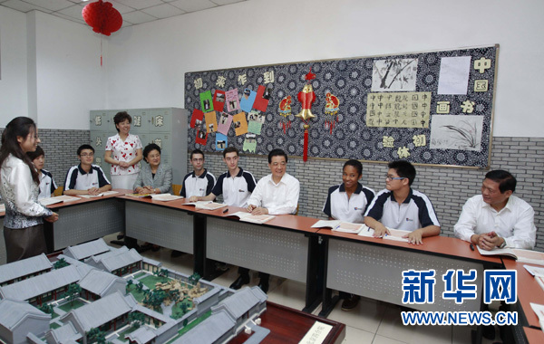 9月9日,在第二十七个教师节即将到来之际,胡锦涛总书记来到北京市第八十中学,亲切看望师生员工。这是胡锦涛在该校国际部语言一班观摩汉语课,同中国教师和外籍学生亲切交谈。新华社记者鞠鹏摄