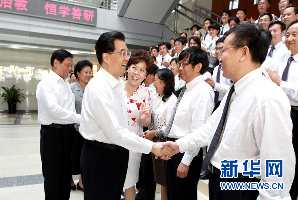 在教学楼一层大厅,胡锦涛亲切接见了学校教师代表。总书记动情地说:“长期以来,各位老师献身教育事业,勤勉工作,默默奉献,为促进学生德智体美全面发展付出了大量心血。我们感谢大家,向你们表示崇高的敬意!”