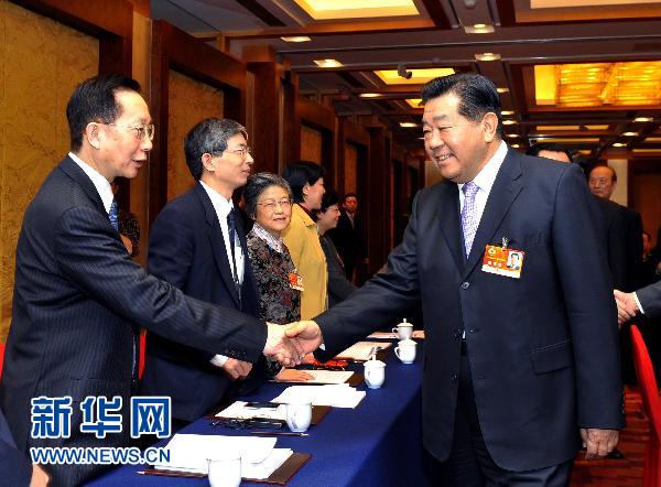 3月6日,中共中央政治局常委、全国政协主席贾庆林参加全国政协十一届四次会议民革、台盟、台联界委员联组讨论。 新华社记者 王晔 摄 |