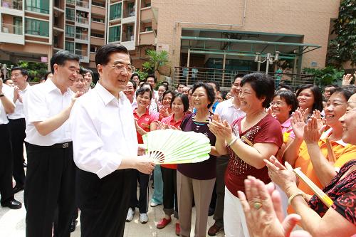 9月4日至6日,中共中央总书记、国家主席、中央军委主席胡锦涛在广东深圳考察工作。这是胡锦涛在罗湖区南湖街道渔民村社区文化广场,同正在舞扇子健身的居民们热情攀谈,祝愿大家今后的生活更富裕、更文明、更安宁、更幸福。新华社发