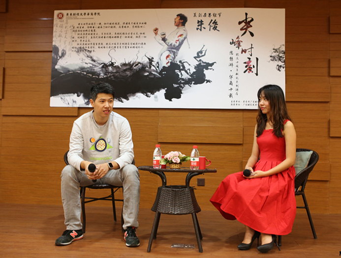 近日,广东财经大学华商学院“思想湃•华商十载”校庆十周年献礼系列讲座之《尖峰时刻》在我院图书馆报告厅顺利开展,学院团委和院学生会特邀世界花剑冠军朱俊先生为我校学生分享其背后的励志故事。学院郭银华副院长、院办吕书勉副主任、学院团委刘苗副书记、学院党委组织科骆帼棣副科长、学院团委办公室黄剑年老师以及各二级院系团总支书记、指导老师和青年教师代表参加了本次讲座。