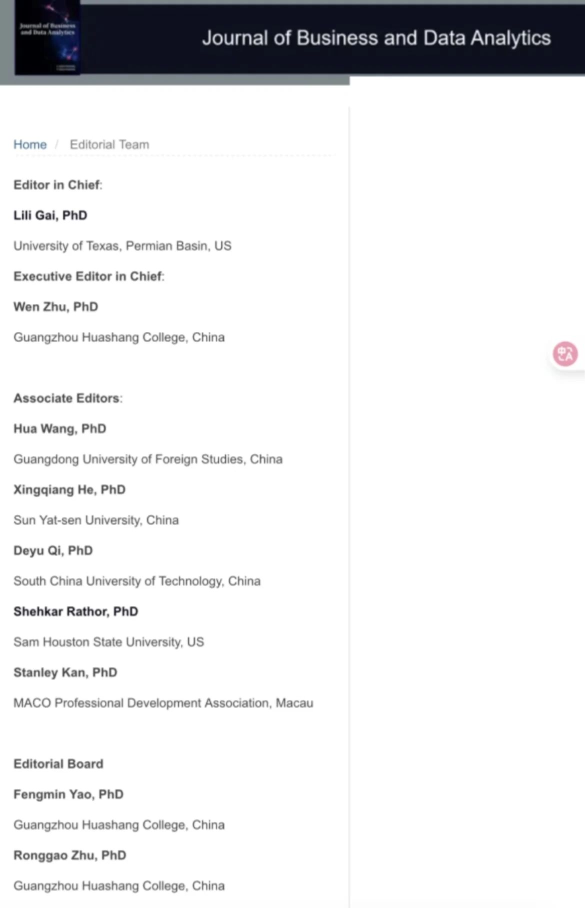 作为大湾区民办高校首本获批的国际英文学术期刊,《Journal of Business and Data Analytics》专注商科与数据科学前沿,汇聚全球智慧,致力于打造国际一流学术交流平台。在华商科教集团和广州华商学院领导的大力支持下,期刊团队提出“三年内冲击EI收录”的目标,助力学科建设,提升学校国际学术影响力。